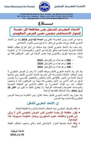 هذا هو البلاغ الذي صدر عقب لقاء الحوار الاجتماعي ليوم الجمعة 2 نونبر 2018 بين وفد من الاتحاد المغربي للشغل و وفد وزاري والذي تشبثت فيه الحكومة بنفس العرض :