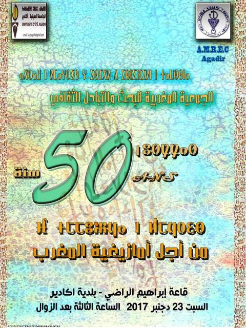 بتنسيق مع جمعية الجامعة الصيفية، يحتفل فرع الجمعية المغربية للبحث والتبادل الثقافي بالذكرى 50 لتأسيس أمريك (1967-2017) من خلال ندوة وطنية لتسليط الضوء على نصف قرن من العمل الجاد والنضال من أجل أمازيغية المغرب على واجهات مختلفة بدءا بالنشر والابداع بالأمازيغية مرورا بتأطير الأجيال من خلال خلق الفروع في مختلف أنحاء المغرب ثم تشجيع الطاقات الابداعية بالأمازيغية في مختلف المجالات فالسعي لتقوية التنسيق بين مكونات الحركة الأمازيغية ثم الترافع حول القضية أمام المجتمع المدني والأحزاب السياسية ومؤسسات الدولة. تنظم الندوة يوم السبت 23 دجنبر 2017 على الساعة الثالثة بعد الزوال بقاعة بلدية أكادير,