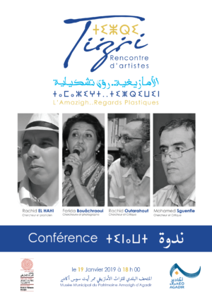 ينظم بالمتحف البلدي للتراث الامازيغي بممر ايت سوس باكادير بشراكة مع المجلس الجماعي لاكادير ملتقى الفنانين التشكيليين الذي سيضم ندوة حول الامازيغية بمنضور تشكيلي مع ندوة حول الامازيغية والفن التشكيلي بمشاركة رشيد اوترحوت، محمد السكنفل،رشيد الحاحي و فريدة البوعشراوي وذلك يوم السبت 19 يناير 2019 ابتداء من الساعة السادسة مساء بالمتحف البلدي للتراث الامازيغي باكادير.والدعوة عامة.