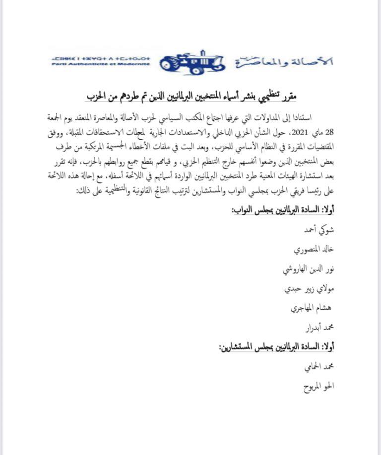 استنادا إلى المداولات التي عرفها اجتماع المكتب السياسي لحزب الأصالة والمعاصرة المنعقد يوم الجمعة 28 ماي 2021، حول الشأن الحزبي الداخلي والاستعدادات الجارية لمحطات الاستحقاقات المقبلة، ووفق المقتضيات المقررة في النظام الأساسي للحزب، وبعد البت في ملفات الأخطاء الجسيمة المرتكبة من طرف بعض المنتخبين الذين وضعوا أنفسهم خارج التنظيم الحزبي، و قيامهم بقطع جميع روابطهم بالحزب، فإنه تقرر بعد استشارة الهيئات المعنية طرد المنتخبين البرلمانيين الواردة أسمائهم في اللائحة أسفله، مع إحالة هذه اللائحة على رئيسا فريقي الحزب بمجلسي النواب والمستشارين لترتيب النتائج القانونية والتنظيمية على ذلك: