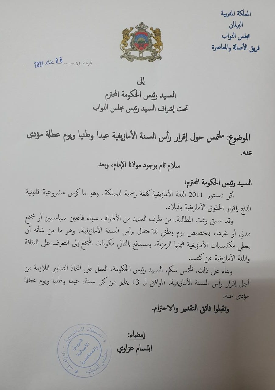 أزول بريس – علم الموقع من مصدر مطلع أن النائبة البرلمانية الشابة إبتسام عزاوي وجهت ملتمس موجها إلى السيد رئيس الحكومة لإقرار رأس السنة الأمازيغية، الموافق ل13 يناير، عيدا وطنيا ويوم عطلة مؤدى عنه.