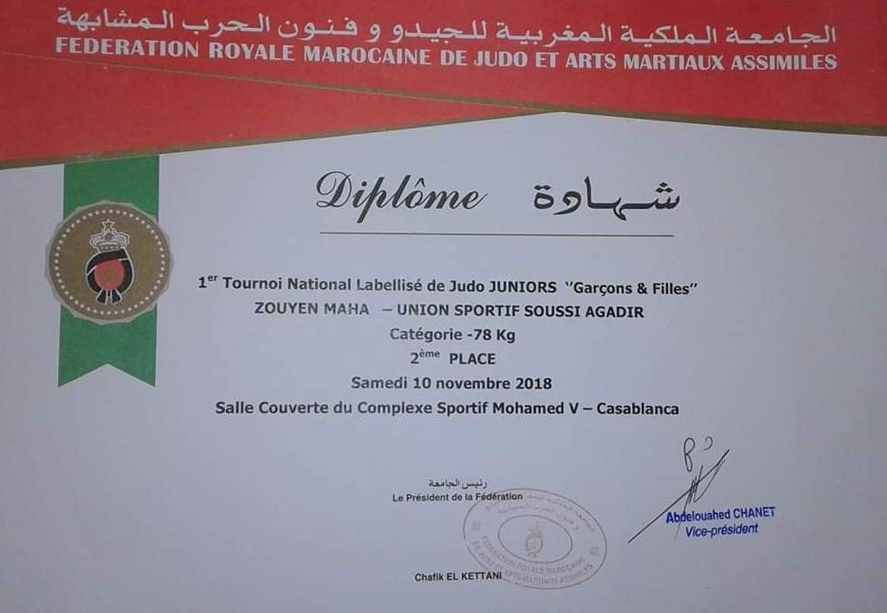 فازت البطلة ” ماها الزوين” من جمعية الاتحاد الرياضي السوسي للجيدو بأگادير والمنضوية تحت لواء عصبة سوس ماسة درعة الصحراء للجيدو بميداليتين : فضية في وزن أقل من 78 كلغ شبان وشابات ونحاسية في فئة الكبار والكبيرات في ” بطولة المغرب للجيدو ” والتي أقيمت يومي 10 و 11 نونبر 2018 بمدينة الدار البيضاء.