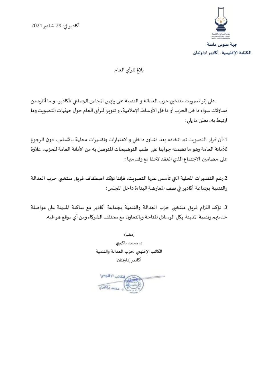 ثالثا: نؤكد التزام فريق منتخبي حزب العدالة والتنمية بجماعة أكادير مع ساكنة المدينة على مواصلة خدمتهم وتنمية المدينة بكل الوسائل المتاحة وبالتعاون مع مختلف الشركاء ومن أي موقع هو فيه.