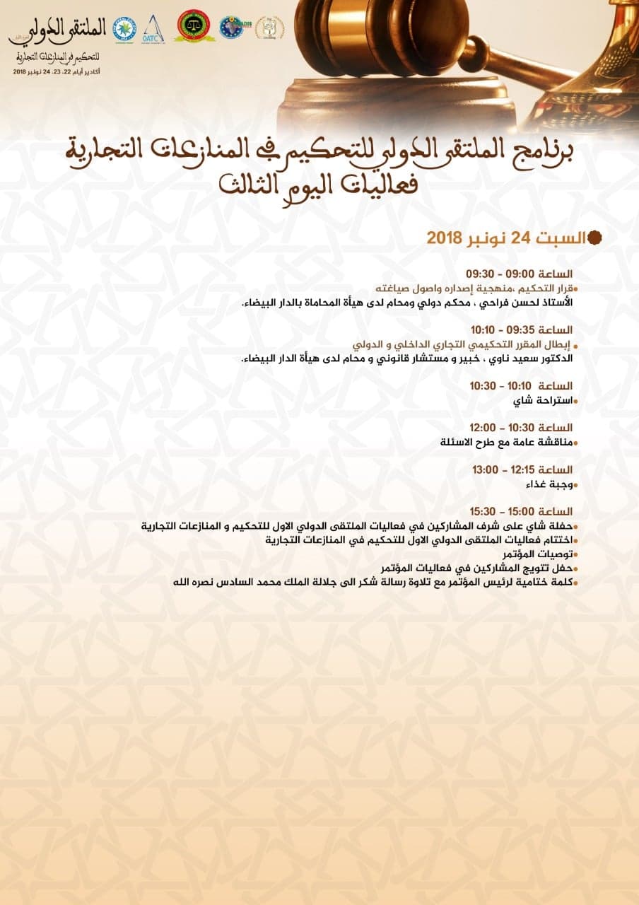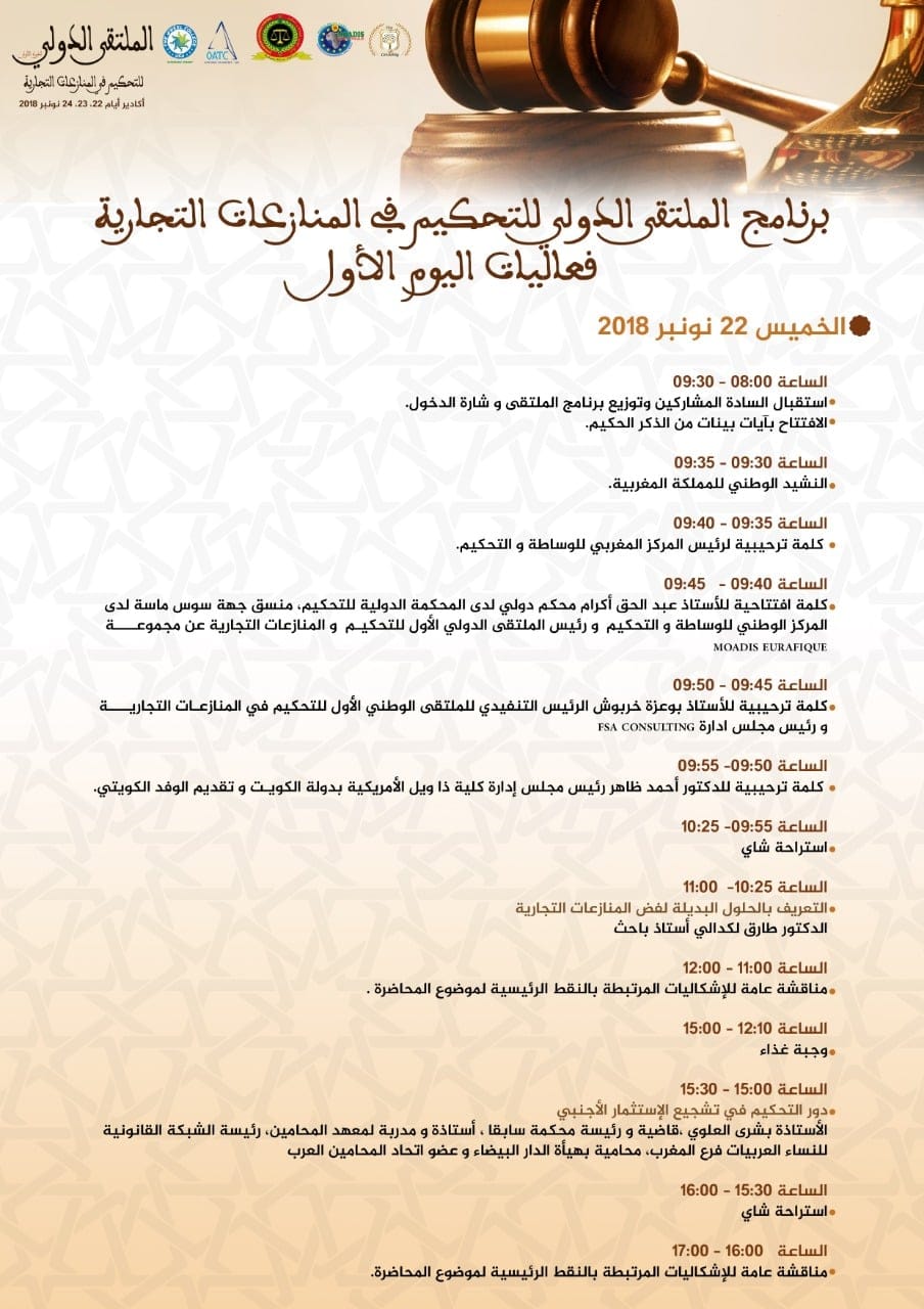 ينظم باكادير في الفترة الممتدة من 22 الى 24 نونبر 2018،الملتقى الدولى للتحكيم في المنازعات التجارية في نسخته الاولى وهو فرصة لتبادل الخبرات في هذا المجال ولاستمرار الاستثمار في ظروف يسودها الحس الديمقراطي والحفاظ على مصالح الجميع .وهذا هو برنامج الملتقى: