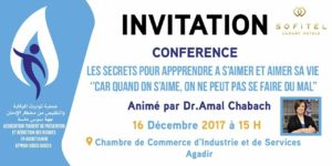 جمهور اكادير على موعد غذا  السبت 16 دجنبر 2017مع الدكتورة امل شباش  بغرفة التجارة والصناعة والخدمات على الساعة الثالثة زوالا في موضوع :” الاسرار والوصفات لتعلم الحب للنفس وحب الحياة” لانه لما نحب نفسنا لايمكن ان نؤديها.المبادرة تأتي من طرف جمعية تودرت للوقاية والتقليص من مخاطر الادمان لجهة سوس ماسة.
