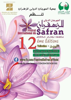 جمعية المهرجان الدولي للزعفران تنظم الدورة 12 من المهرجان الدولي للزعفران بتالوين ، من 2 الى 4 نونبر 2018 بتالوين تحت اشراف وزارة الفلاحة والصيد البحري و المغرب الاخضر.