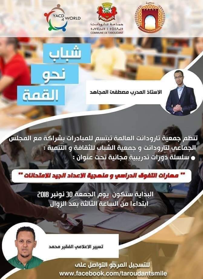 بعد نجاح الدورات 8 بمدينة تارودانت تنظم جمعية تارودانت العالمة تبتسم للمبادران بشراكة مع جماعة تارودانت و بتنسيق مع جمعية الشباب للثقافة و التنمية مبادرة ” سلسلة دورات مهارات التفوق الدراسي ومنهجية الاعداد الجيد للامتحانات ” مع المدرب المحترف الاستاذ مصطفى المجاهد. الدورة 9 : يوم الاربعاء 9 يناير 2019 باعدادية الرحال المسكيني ابتداء من الساعة الثالثة بعد الزوال (15h ).