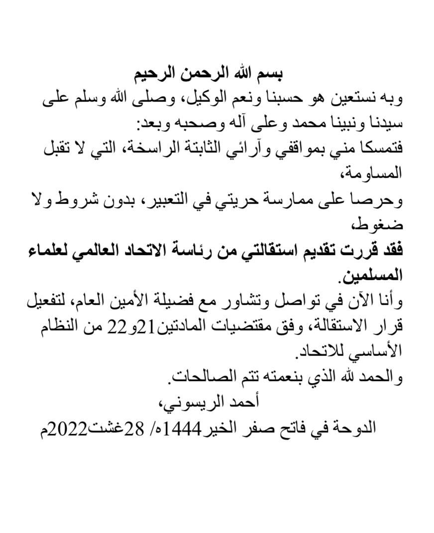 أعلن أحمد الريسوني تقديم استقالته من رئاسة الاتحاد العالمي لعلماء المسلمين.