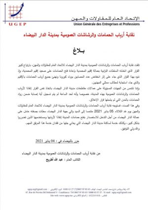 وعبرت نقابة أرباب الحمامات والرشاشات العمومية بمدينة الدار البيضاء عن ارتياحها للقرار الأخير ، ملتمسة في ذات السياق السماح بإعادة فتح حمامات مدينة الدار البيضاء.