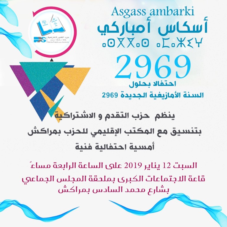 ينظم حزب التقدم والاشتراكية بتنسيق مع المكتب الإقليمي للحزب بمراكش أمسية فنية احتفالا بحلول السنة الأمازيغية الجديدة 2969، وذلك يوم السبت 12 يناير 2019 على الساعة الرابعة عصرا ، بقاعة الاجتماعات بملحقة المجلس لجماعي شارع محمد السادس بمراكش