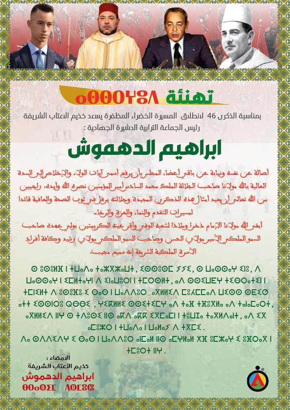 السيد ابراهيم الدهموش رئيس الجماعة الترابية الدشيرة الجهادية يهنئ صاحب الجلالة بمناسبة الذكرى 46 للمسيرة الخضراء