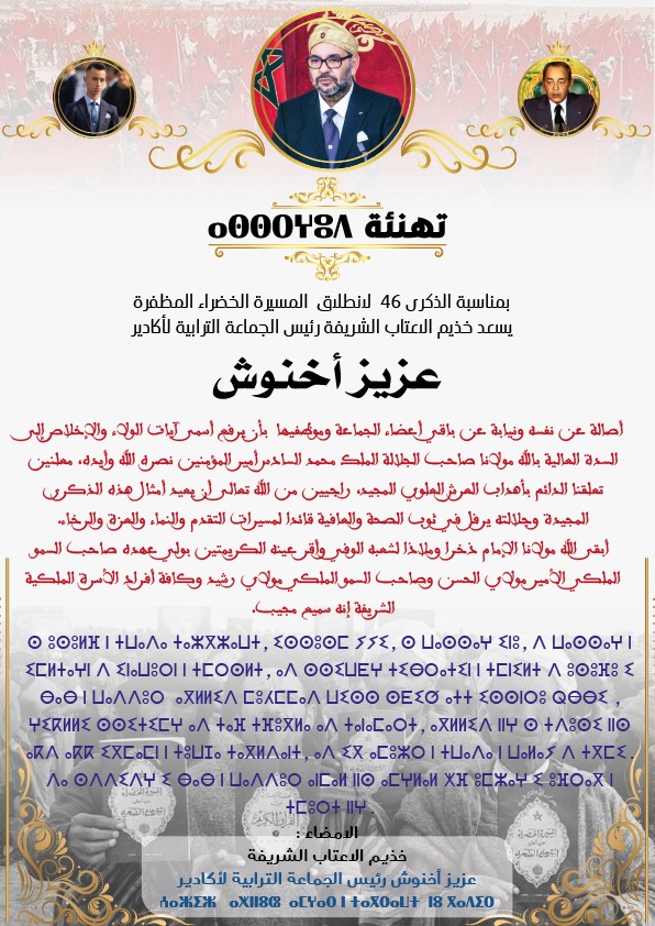 السيد عزيز أخنوش رئيس جماعة أكادير يهنئ جلالة الملك بمناسبة الذكرى 46 للمسيرة الخضراء