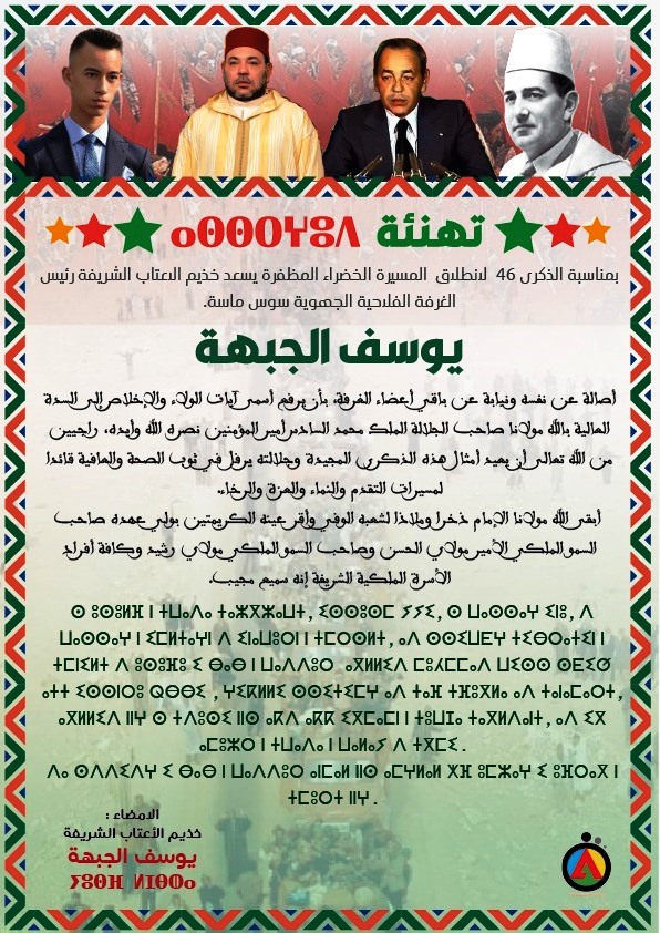 السيد يوسف الجبهة رئيس الغرفة الفلاحية الجهوية سوس ماسة يهنئ جلالة الملك بمناسبة الذكرى 46 للمسيرة الخضراء