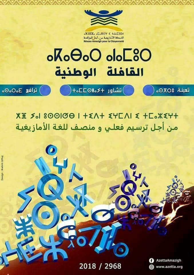 أطلقت الشبكة الأمازيغية من أجل المواطنة قافلتها الوطنية ” ⴰⴽⴰⴱⴰⵔ ⵏ ⵓⵣⴻⵟⵟⴰ ⴰⵎⴰⵣⵉⵖ ” تحت شعار: من أجل ترسيم فعلي ومنصف للغة الأمازيغية ” ⵅⴼ ⵢⴰⵏ ⵓⵙⵙⵏⵚⴱ ⵏ ⵜⵉⴷⵜ ⵉⵖⵎⴷⵏ ⵉ ⵜⵎⴰⵣⵉⵖⵜ في إطار استراتيجيتها النضالية الهادفة إلى الترسيم الفعلي للغة الأمازيغية وتنفيذا للبرنامج الترافعي الوطني حول مشروعها ومقترحاتها بخصوص القانون التنظيمي المتعلق بتفعيل الطابع الرسمي للغة الأمازيغية، تنظم الشبكة الأمازيغية من أجل المواطنة قافلة وطنية ترافعية ” aⴽabar ⵏ ⵓⵣⵟⵟⴰ ⴰⵎⴰⵣⵉⵖ “، تهدف إلى مواصلة التشاور مع مختلف المتدخلين السياسيين والمنتخبين و الفعاليات المدنية والجمعوية وعموم المواطنين حول رؤية الحد الأدنى التي تقدمت بها أزطا أمازيغ في مذكرتها التفاعلية مع مشروع قانون الدولة المغربية -26-16 وكذا الانخراط في خطوات تعبوية لبسط التبعات السياسية والحقوقية لتجاهل مطالب أزطا أمازيغ والحركة الأمازيغية والتفكير المشترك في سبل النضال الممكنة ضد التراجع الفعلي للدولة المغربية عن الترسيم الدستوري. وقد اختارت “أزطا أمازيغ” أن يصادف موعد انطلاق هذه القافلة الترافعية مناسبة تاريخية للشعب المغربي وهي الاحتفال برأس السنة الأمازيغية؛ حيث ستنظم أنشطة ترافعية مختلفة من طرف فروع أزطا بسبع مدن وقرى بستة أقاليم وعمالات (الرباط، تيزنيت، تالوين بتارودانت، تنالت باشتوكة ايت بها، بويزكارن وإفران بكلميم، و أقايغان بطاطا)، على أن تستمر القافلة بعد ذلك في باقي جهات المغرب، بتنظيم أنشطة نضالية وتعبوية متميزة تحت شعار واحد ” من أجل ترسيم فعلي ومنصف للغة الأمازيغية “. الشبكة الامازيغية من اجل المواطنة