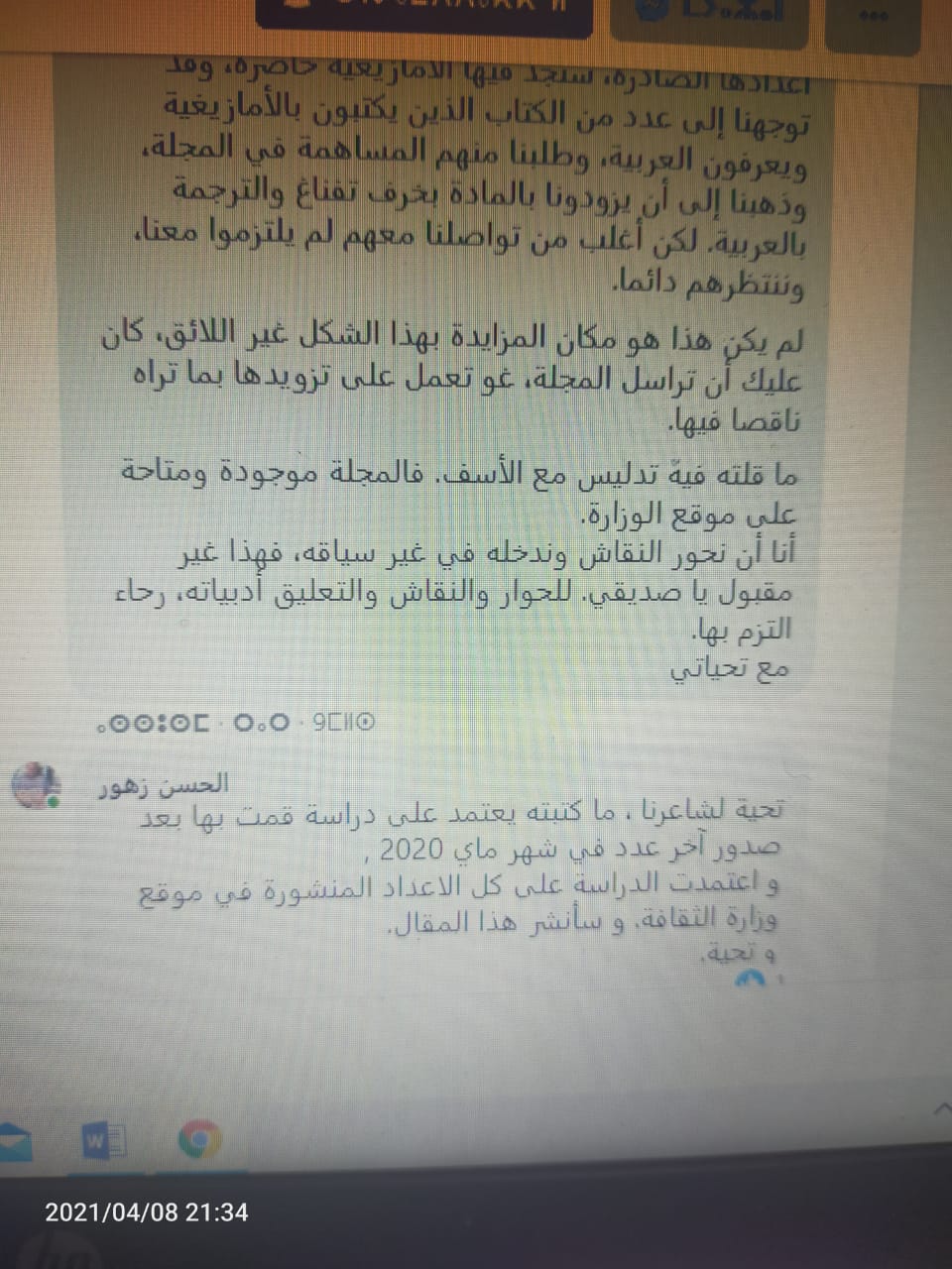 ” تحية لشاعرنا، ما كتبته يعتمد على دراسة قمت بها بعد صدور آخر عدد في شهر ماي 2020. و اعتمدت الدراسة على كل الاعداد المنشورة في موقع وزارة الثقافة، و سأنشر هذا المقال. وتحية”.