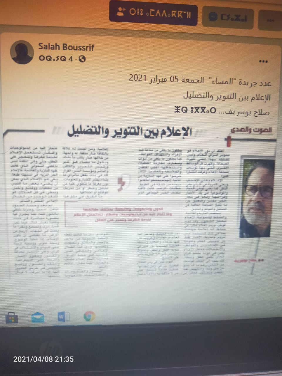 أزول بريس – نشر الشاعر والكاتب صلاح بوسريف المدير المسؤول عن مجلة” الثقافة المغربية” في صفحته بالفيس يوم 4 فبراير 2021 مقالا بعنوان” الاعلام بين التنوير والتضليل”, نشره في عموده الاساسي بجريدة المساء ليوم 5 فبراير2021، تحدث فيه عن الاعلام باعتباره: ” وسيلة تنوير ووسيلة تربية على الرأي و الاختلاف في الرأي، وعلى الانتصار للعدالة و القانون وحقوق الانسان…ووضع الشمس في طريق الجميع”.