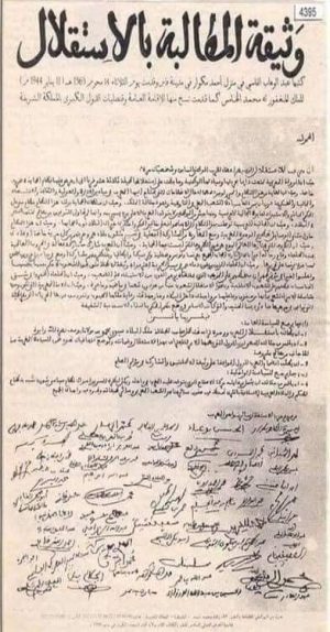 في 11 يناير 1944 قام رجال الحركة الوطنية بتنسيق مع الملك محمد الخامس، بخوض معركة نضالية حاسمة ،تمثلت في تقديم وثيقة المطالبة بالاستقلال إلى سلطات الحماية الفرنسية وتسليم نسخ منها إلى المقيم العام غابرييل بيو وإلى القنصلين العامين لبريطانيا العظمى والولايات المتحدة وإلى الجنرال ديغول وسفير الاتحاد السوفيتي بالجزائر الفرنسية.