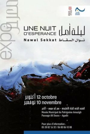احتفالا باليوم الوطني للمرأة المغربية ستكون مدينة أكادير على موعد مع الفنانة التشكيلية نوال السقاط لعرض لوحاتها الفنية من 12 أكتوبر الى غاية 10 نونبر 2018 و قد اطلقت على معرضها اسم :” ليلة امل”، المعرض من تنظيم المجلس الجماعي لاكادير بتنسيق مع المتحف البلدي للتراث الامازيغي، على ان يكون الافتتاح يوم الجمعة 12 اكتوبر 2018 على الساعة السابعة مساء بالمتحف الكائن بمم ايت سوس قرب مقهى لافنتين.