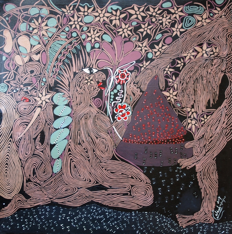 من خلال ملاحظة لهذه الاعمال القديمة والجديدة والتطور الحاصل، يتضح انها تعكس واقع بسيط من حيث التناول المفاهيمي للانشغال والهم الفني لديه، الذي يجد له صدا بين توالي موجات وترددات خطوط، أحيانا تنسجها ممرات نمل أسود، أو ملامح وجوه واقنعة بالية وتراجيدية، ومجموعة متوالفة أخرى لحشرات وحيوانات وأوراق شجر وزهور… ترسم نوعا من الفنتازيا والايقاعات البصرية المتراقصة الدائرية أحيانا أو المستوية في تراكيب تلقائية ينسجها على منواله الخاص (des plans et compositions).