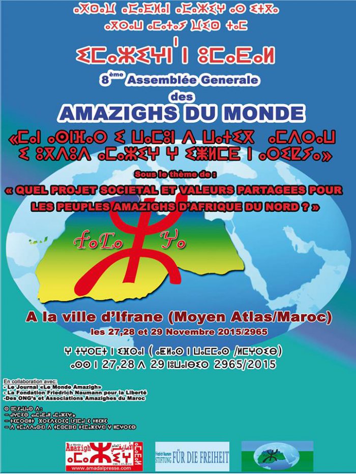 تحت شعار “ما هو المشروع المجتمعي والقيمي المشترك للشعب الأمازيغي؟” ينظم التجمع العالمي الأمازيغي (A (AM، بالتعاون مع جريدة العالم الأمازيغي، ومؤسسة فريدريش ناومان الألمانية، والجمعيات والمنظمات غير الحكومية الأمازيغية المغربية، المؤتمر الثامن للتجمع العالمي الأمازيغي بمدينة إفران المغربية في منطقة الأطلس المتوسط، أيام 27، 28 و29 نونبر 2015/2965.