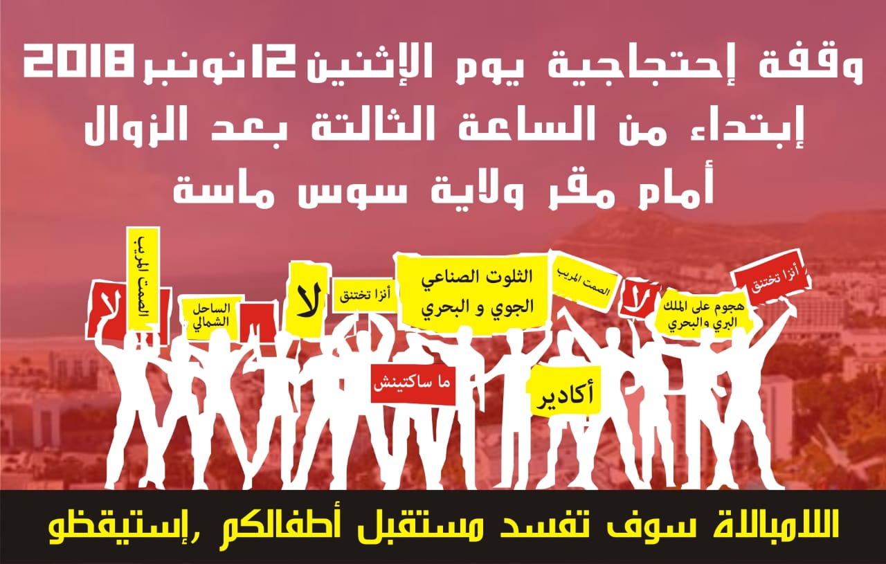لذلك، فإننا كفاعلين مدنيين وجمعويين نعتبر نفسنا طرفا في هذه القضية، نهيب بكافة الجماهير والطاقات الغيورة على مستقبل منطقتنا البيئي المشترك، من أجل المشاركة المكثفة بغية إنجاح الوقفة المزمع تنظيمها يوم الإثنين 12 نونبر 2018 ابتداءً من الساعة الثالثة بعد الزوال أمام مقر ولاية جهة سوس ماسة، حتى نتمكن جمبعا من الترافع للمطالبة بما يلي: