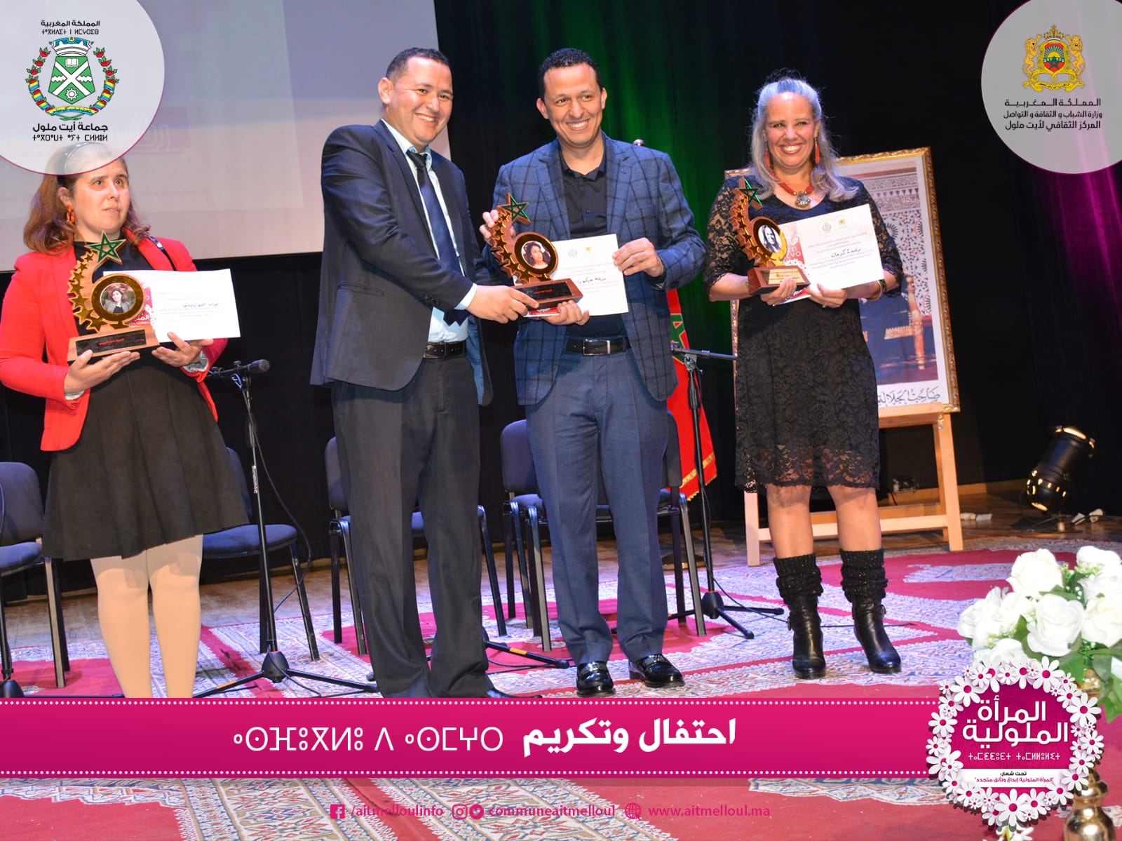 ليسدل الستار على هذا الأسبوع الاحتفالي بتنظيم حفل فني تكريمي لعدد كبير من الفعاليات النسائية بأيت ملول في مختلف المجالات الفنية، الثقافية، الاجتماعية والرياضية. بالإضافة إلى تكريم موظفات بالجماعة الترابية أيت ملول، وصانعات الجمال والفاعلات الجمعويات بالمدينة، لتكون هذه فرصة توقف معها الجميع اعترافا وتثمينا للدور المحوري الذي تلعبه المرأة المغربية، والسوسية والملولية بشكل خاص من أجل النهوض بالمجتمع والارتقاء به إلى أعلى المراتب.