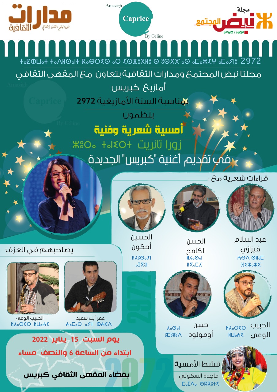 احتفل المقهى الثقافي أمازبغ كابريس بالسنة الأمازيغية الجديدة 2972 في أمسية ممتعة ورائعة مساء السبت 15 يناير 2022 ، رغم الجائحة التي عادت بمتحور جديد فرض شروطه الاحترازية على الجميع، افتتح الحفل بكلمات المنطمين مقهى كبريس ومجلتي نبض المجتمع ومدارات الثقافية: