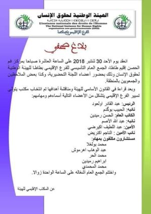 فيما يلي البلاغ الصحفي لتاسيس الفرع الاقليمي للهيئة الوطنية لحقوق الانسان بطاطا: