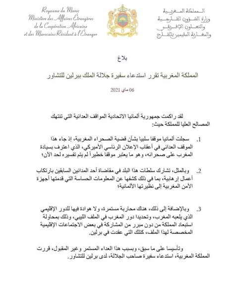 وحسب ما سبق، وبسبب هذا العداء المستمر وغير المقبول، خلص بلاغ وزارة الشؤون الخارجية والتعاون الإفريقي والمغاربة المقيمين بالخارج إلى أن المملكة المغربية، قررت استدعاء سفيرة صاحب الجلالة، لدى برلين للتشاور.