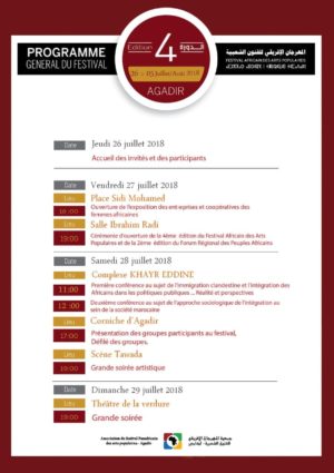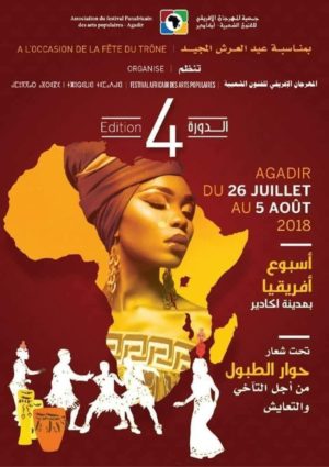 تنطلق بمدينة اكادير فعاليات الدورة الرابعة لمهرجان الفنون الشعبية والذي ينظم من طرف جمعية المهرجان الافريقي للفنون الشعبية باكادير وذلك في الفترة الممتدة من 26 يوليوز الى 5غشت 2018 تحت شعار:” حوار الطبول من اجل التاخي والتعايش” وهي تظاهرة تندرج في اطار الاحتفال بعيد العرش المجيد