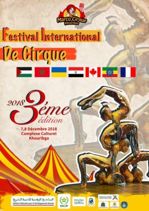 تستضيف مدينة خريبكة فعاليات الدورة الثالثة للمهرجان الدولي لفنون السيرك المنظم بالمركب الثقافي لمدينة خريبكة وبمسرح الهواء الطلق بمنتزه بني عمير من طرف جمعية البهلوان ماركو للتربية والثقافة يومي 7 و 8 دجنبر الجاري والمقام بشراكة مع المبادرة الوطنية للتنمية البشرية والمكتب الشريف للفوسفاط والشركاء الأساسيين.