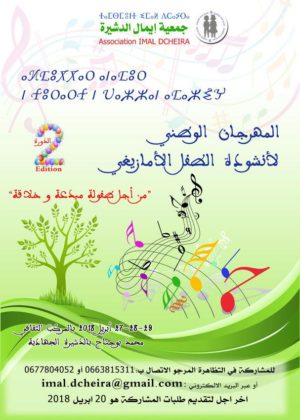 تحت شعار :من أجل طفولة مبدعة وخلاقة تنظم جمعية ايمال بالدشيرة الدورة الثانية للمهرجان الوطني لأنشودة الطفل الأمازيغي من 27 الى 29 ابريل 2018 بالمركب الثقافي محمد بوجناح بالدشيرة الجهادية ويتضمن عدة مجموعات صوتية مهتمة بهذا المجال المرتبط بالطفل.