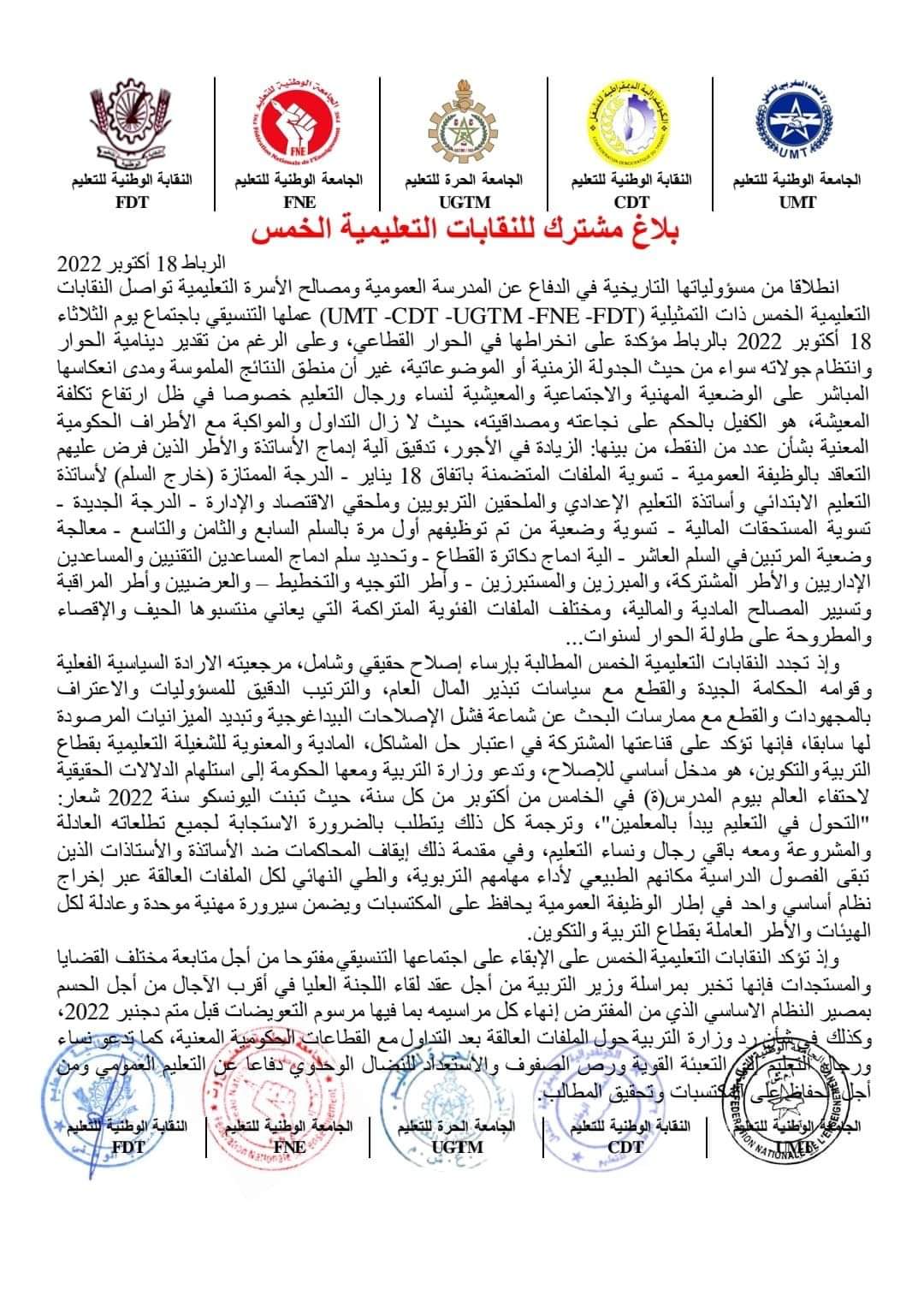 النقابات التعليمية الخمس (الجامعة الوطنية للتعليم UMT النقابة الوطنية للتعليم CDT الجامعة الحرة للتعليم UGTM الجامعة الوطنية للتعليم FNE النقابة الوطنية للتعليم FDT) وهي تؤكد في البلاغ على الإبقاء على اجتماعها التنسيقي مفتوحا من أجل متابعة مختلف القضايا والمستجدات فإنها تخبر بمراسلة وزير التربية من أجل عقد لقاء اللجنة العليا في أقرب الآجال من أجل الحسم بمصير النظام الاساسي الذي من المفترض إنهاء كل مراسيمه بما فيها مرسوم التعويضات قبل متم دجنبر 2022، وكذلك في شأن رد وزارة التربية حول الملفات العالقة بعد التداول مع القطاعات الحكومية المعنية، وتدعو بالمقابل نساء ورجال التعليم إلى التعبئة القوية ورص الصفوف والاستعداد للنضال الوحدوي دفاعا عن التعليم العمومي ومن أجل الحفاظ على المكتسبات وتحقيق المطالب يقول البلاغ.