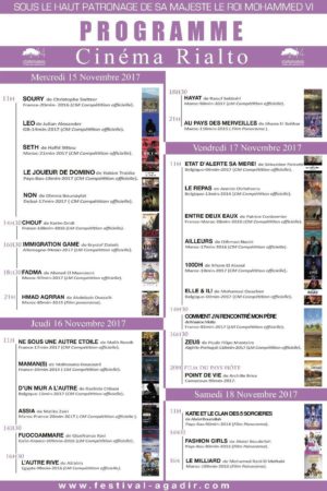 تنطلق فعاليات مهرجان السينما والهجرة باكادير في دورته 14 يوم الثلاثاء 14 نونبر 2017 بحضور عدد من الفنانين المغاربة والاجانب مع تقديم برنامج غني ومتنوع من الافلام ذات طابع الهجرة وفيما بلي برنامج الدورة: