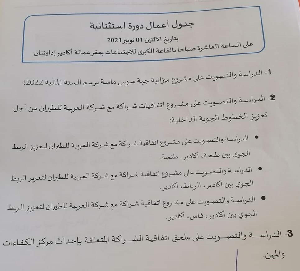 يعقد مجلس جهة سوس ماسة دورته الثانية الاستثنائية برئاسة الرئيس كريم أشنكلي لمناقشة جدول أعمال يتضم نقطة رئيسية تتعلق بمناقشة والمصادقة على مشروع ميزانية السنة المقبلة 2022 .