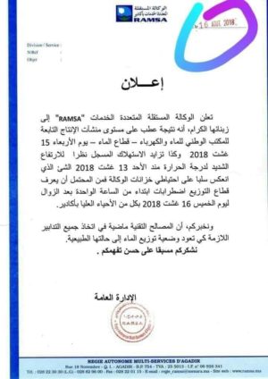 وكانت الوكالة المستقلة المتعددة الخذمات باكادير قد اصدرت بلاغا اليوم الخميس 16 غشت 2018 تطرقت فيه الى هذه الانقطاعات بعدما فوجئ السكان بانقطاع الماء على جل الاحياء ابتداء من الساعة 11 صباحا.