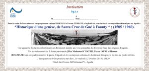 كونوا في الموعد مع اول انطلاقة لشرارة وهج عطاءها الجمعوي برسم موسم 2018-2019 ملتقى ايزوران نوكادير تنبش في الذاكرة وتدغدغ نوستالجيا الامكنة والاعلام وتسبر اغوار الدفائن لتسافر بكم عبر الصورة الفوتوغرافية من سانتاكروز الى فونتي وتعبر بكم ومعكم الة الزمان من 1505 الى 1960 لعلنا نستخلص العبر ونكتشف كنه اكادير وهويته التي تستطع معاول الهدم ان تنالها كلية مادام بمدينة الانبعاث نساء ورجالات صناديد تزمجر صرخاتهم كل خروج عن اغراس اغراس ومس بانفة مدينة ليس لنا منها الا التحسر والتامل واستشراف القادم من الايام لعل غذه مشرق .