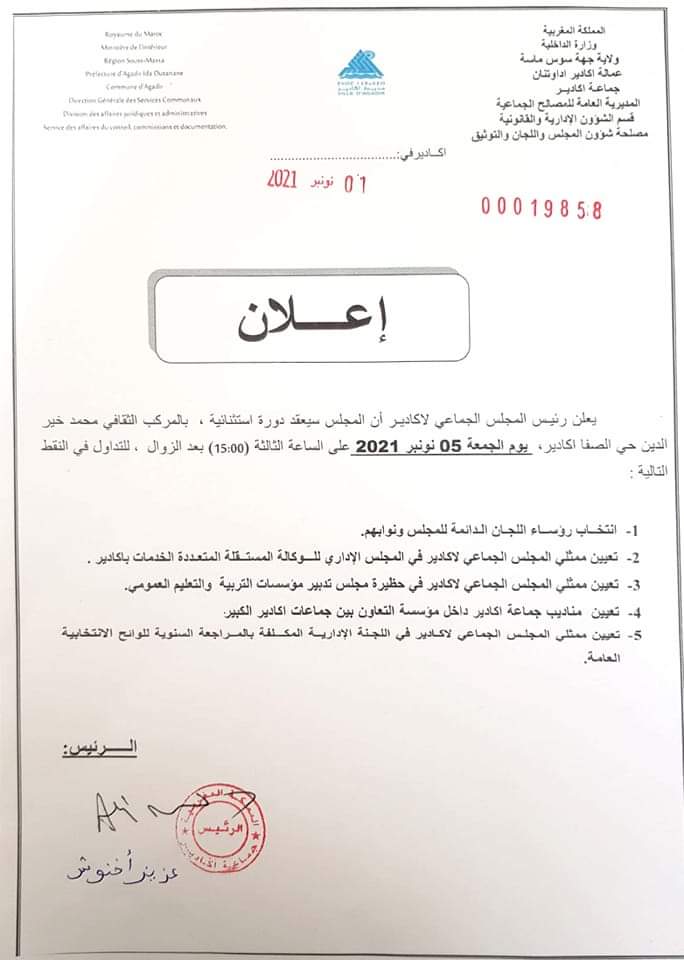 ووجه أخنوش دعوة لأعضاء مجلس الجماعة لعقد دورة استثنائية لشهر نونبر 2021 بناء على إرسالية والي جهة سوس ماسة، عامل عمالة أكادير إداوتنان أحمد حجي.
