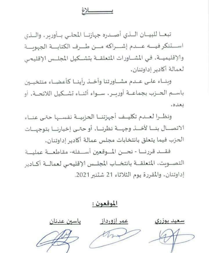 بالوثيقة : اتحاديون بجماعة أورير يقاطعون التصويت على مجلس عمالة أكادير ادوتنان