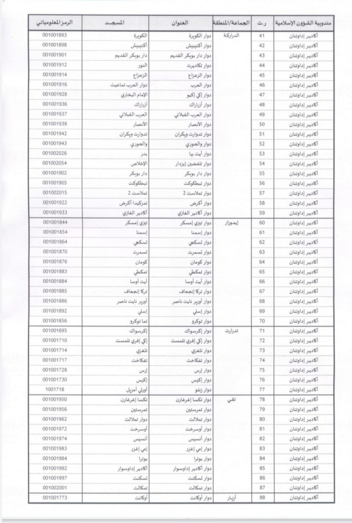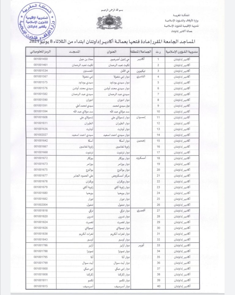 أزول بريس- اعلنت المندوبية الإقليمية للأوقاف والشؤون الإسلامية بأكادير اداوتنان برنامجا خاصا بإعادة فتح المساجد المغلقة بشكل تدريجي وهكذا تمت برمجة إعادة فتح 88 مسجد بتراب عمالة أكادير إداوتنان بداية من الثلاثاء 8 يونيو الجاري