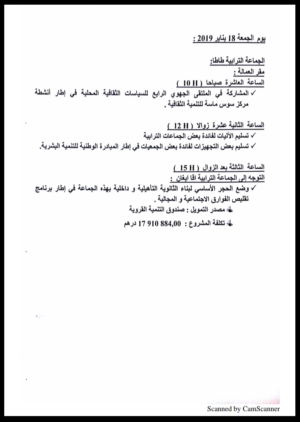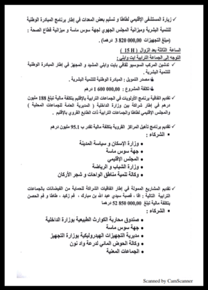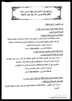 يقوم والي جهة سوس ماسة احمد حجي ورئيس الجهة ابراهيم حافيدي و الوفد المرافق له بزيارة لاقليم طاطا للوقوف على الاشغال والقيام ببعض التدشينات لمشاريع مبرمجة بالاقليم مع زيارات لمنشات واوراش مهمة بطاطا مع المشاركةفي الملتقى الجهوي الرابع للسياسات الثقافية المحلية المنظم من طرف مركز سوس ماسة للتنمية الثقافية تحت شعار:” التراث الطبيعي والثقافي بجهة سوس ماسة من الصيانة الى التثمين:مسارات للتفكير والتخطيط والابتكار” من 18 الى 20يناير 2019 بدينة طاطا بشراكة مع مجلس جهة سوس ماسة وبتعاون مع عمالة اقليم طاطا والجماعة الترابية والمجلس الاقليمي لطاطا وفيما يلي البرنامج العام للوفد: