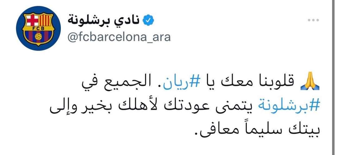 ونشر الحساب الرسمي لنادي برشلونة الناطق بالعربية في “تويتر”، تغريدة أبدى فيها تضامنه مع ريان متمنيا عودته في القريب العاجل إلى أهله حيث جاء في التغريدة: “قلوبنا معك يا ريان. الجميع في برشلونة يتمنى عودتك لأهلك بخير وإلى بيتك سليماً معافى”