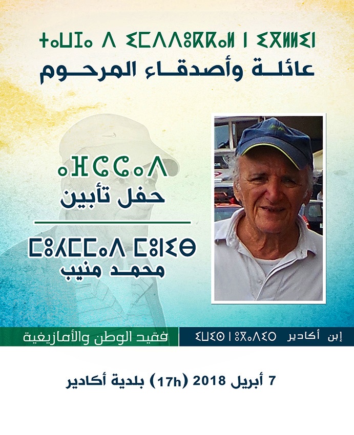 تخبر عائلة وأصدقاء المرحوم محمد منيب عن تنظيمها لحفل تأبين الفقيد يوم السبت 7 أبريل 2018 ابتداء من الساعة الخامسة بعد الزوال بقاعة ابراهيم الراضي ببلدية أكادير. وسيتضمن الحفل شهادات، يقدمها ممثلو المجالس المنتخبة والمؤسسات العلمية والجمعيات الثقافية والفعاليات المدنية تتخللها قصائد شعرية في رثاء المرحوم. كما سيتميز الحفل بعرض شريط قصير يقدم نبذة عن حياة الفقيد مع تنظيم معرض خاص بصور توثق لبعض محطات حياته. ومن المنتظر أن يحظر هذا الحفل التأبيني أفراد من عائلة الفقيد وأصدقائه ومعارفه من مختلف مناطق المغرب ومن الجزائر وفرنسا إلى جانب شخصيات في مختلف الميادين ذات الصلة بمجال اهتمامات الفقيد.