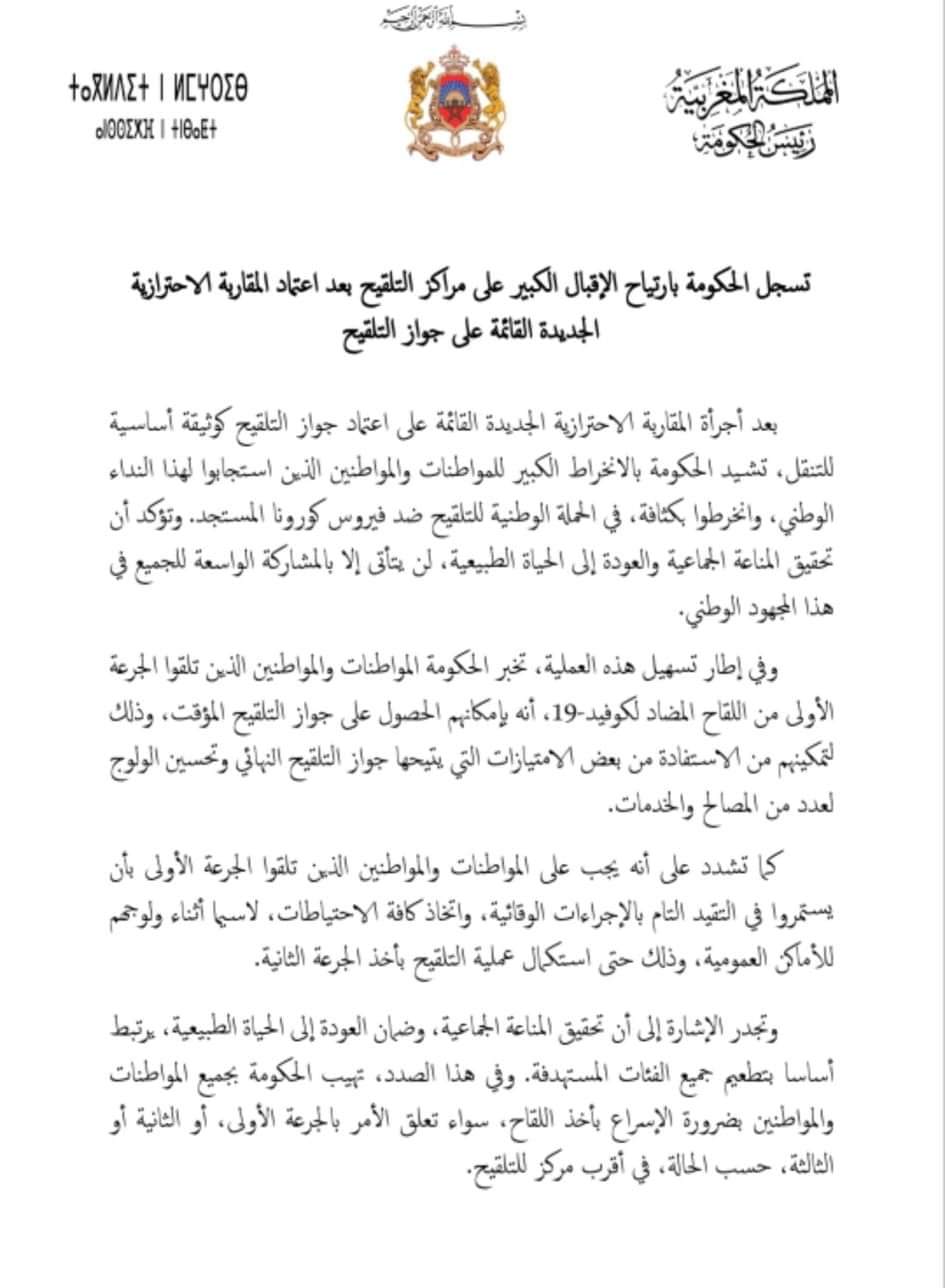 وسجلت الحكومة في بلاغ لها، بارتياح الإقبال الكبير على مراكز التلقيح بعد اعتماد المقاربة الاحترازية الجديدة القائمة على جواز التلقيح