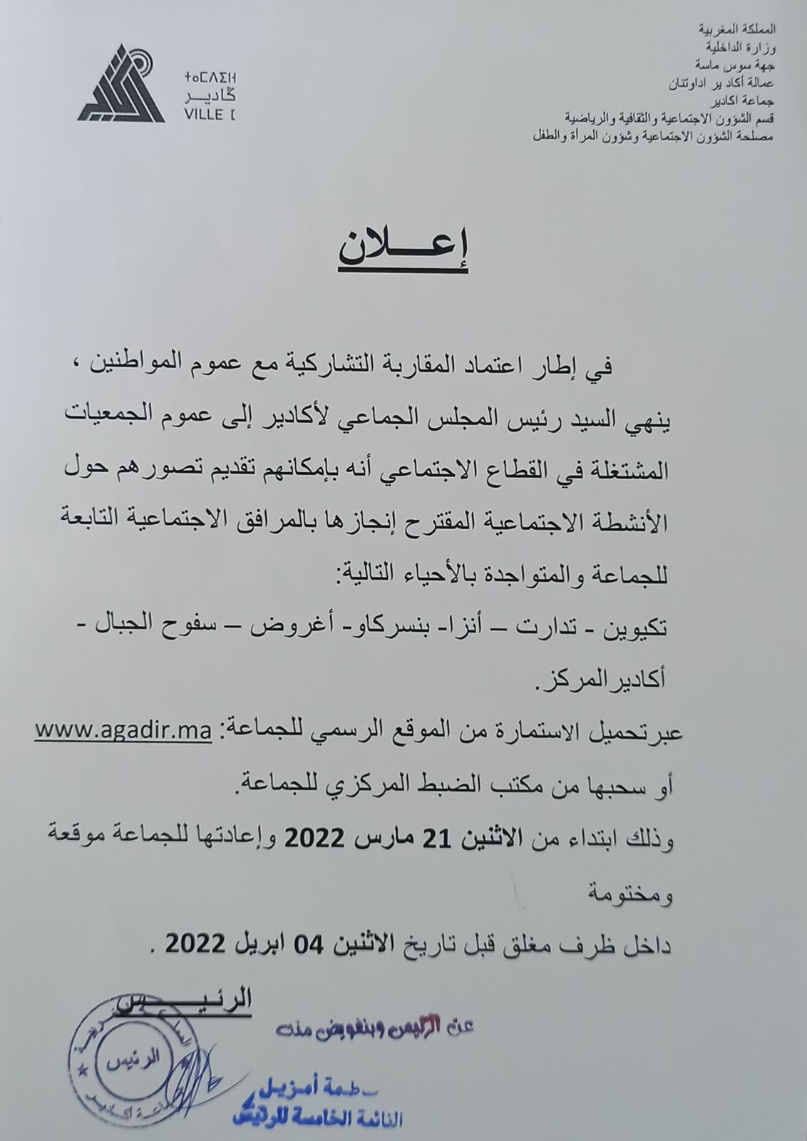 يعلن رئيس المجلس الجماعي لمدينة أكادير أنه بإمكان جميع الجمعيات المشتغلة في القطاع الاجتماعي، تقديم تصورها حول الأنشطة الاجتماعية المقترح إنجازها بالمرافق التابعة للجماعة، وذلك بأحياء تيكيوين وتدارت وأنزا وبنسركاو وأغروض وسفوح الجبال، وفي أكادير المركز.