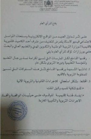 بلاغ للمديرية الاقليمية لورزازات حول الاعتداء الذي تعرض أستاذ بالفصل