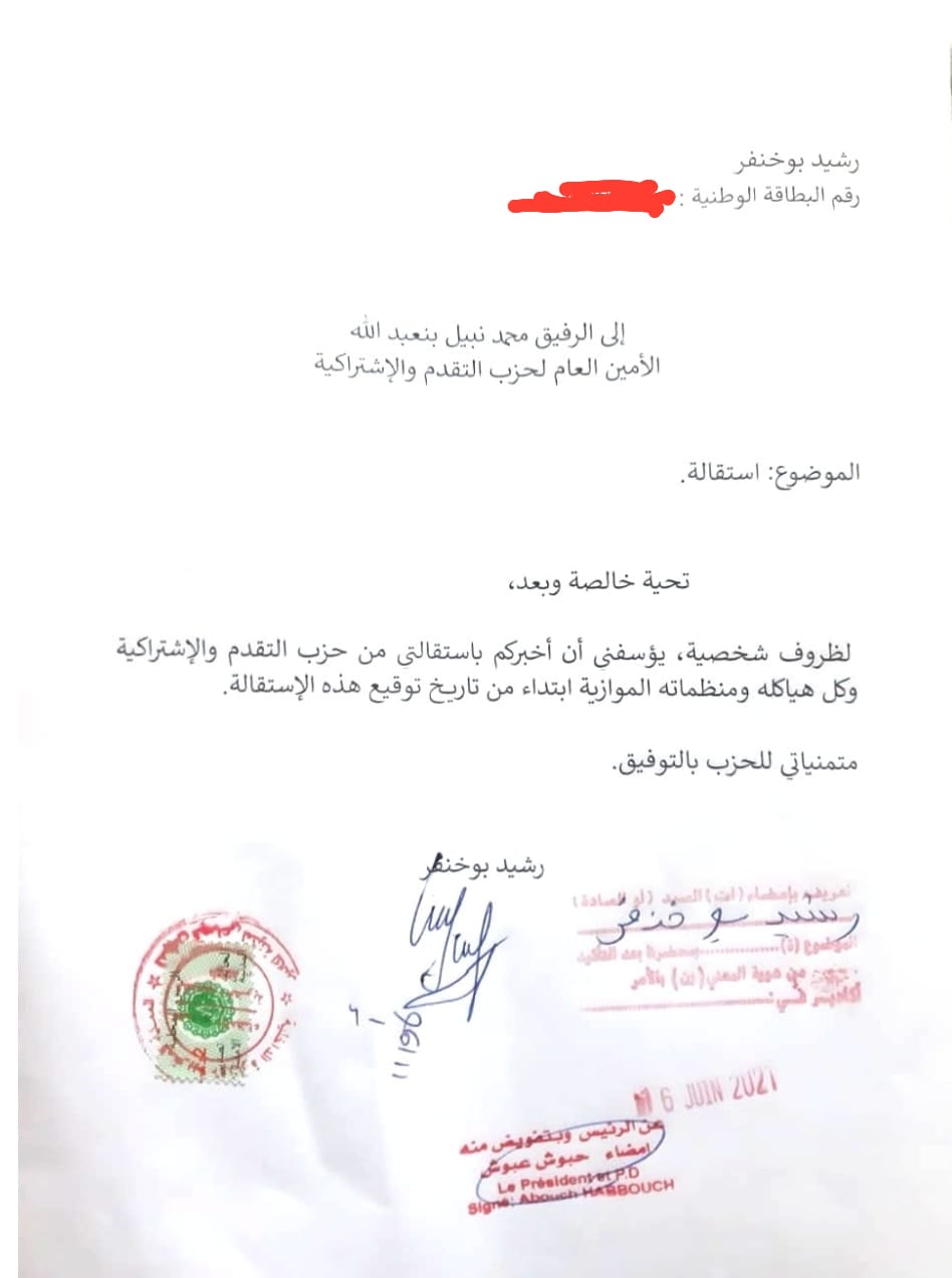 ”لظروف شخصية، يؤسفني أن أخبركم بإستقالتي من حزب التقدم والاشتراكية وكل هياكله ومنظماته الموازية إبتداءا من توقيع هذه الإستقالة”.