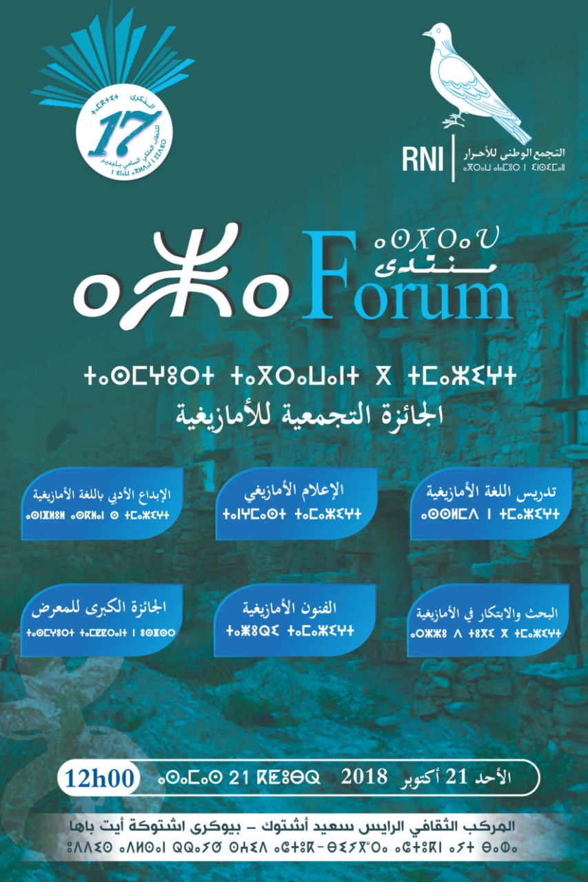 في إطار الذكرى السابعة عشرة للخطاب الملكي بأجدير، ينظم حزب التجمع الوطني للأحرار المنتدى الأمازيغي aZa Forum أيام 19، 20 و21 أكتوبر 2018 بمدينة بيوكرى – إقليم اشتوكة أيت باها، ويسعى الحزب من خلال هذه التظاهرة إلى :