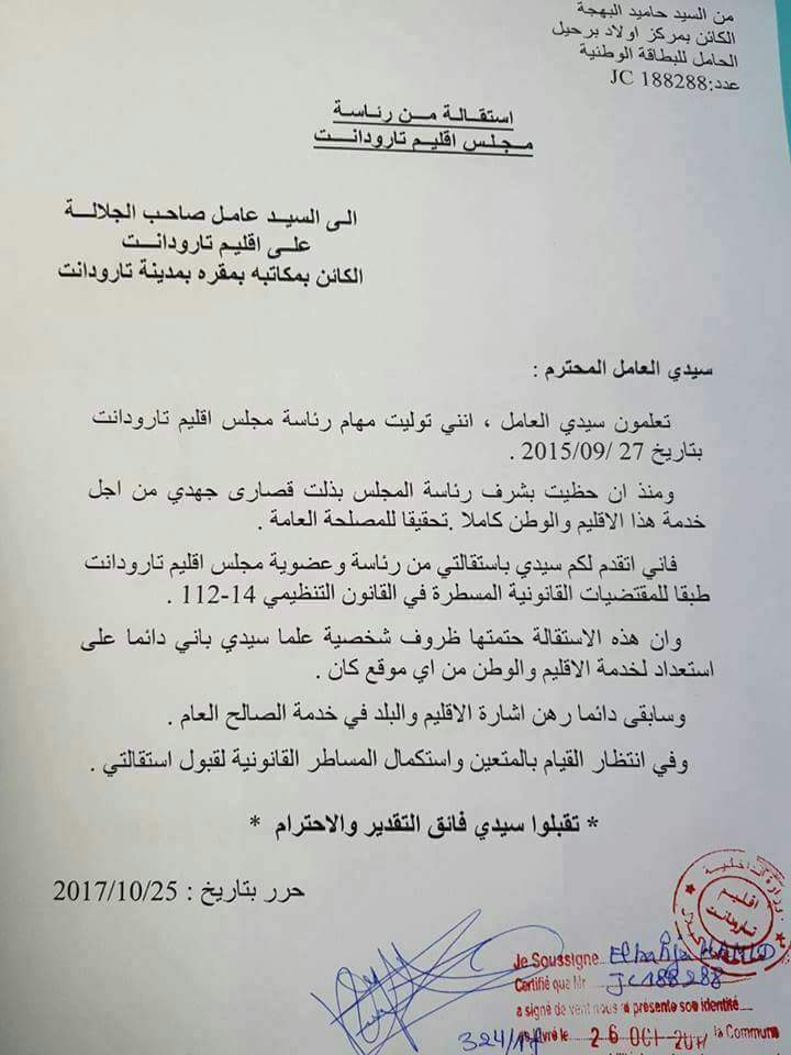 تأكيد استقالة حميد البهجة من المجلس الاقليمي لتارودانت ( نص الاستقالة )
