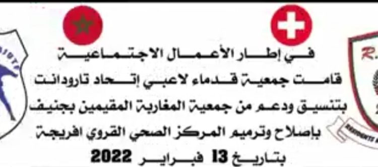 وفي هذا الصدد قامت السيدة القنصل بمعية رئيسي جمعيتي قدماء لاعبي اتحاد تارودانت لكرة القدم وجمعية المغاربة المقيمين بجنيف إلى جانب ممثلي السلطة المحلية بزيارة ميدانية إلى منطقة أولاد بوريوس بجماعة افريجة. وذلك يوم الأحد 13 فبراير 2022 حيث تم تفقد المستوصف الصحي بالجماعة القروية. وفي هذا الإطار تبرعت جمعية المغاربة المقيمين بجنيف بسويسرا بمبلغ 52000 درهم من أجل تحسين وجودة الخدمات الطبية لفائدة ساكنة الجماعة القروية.